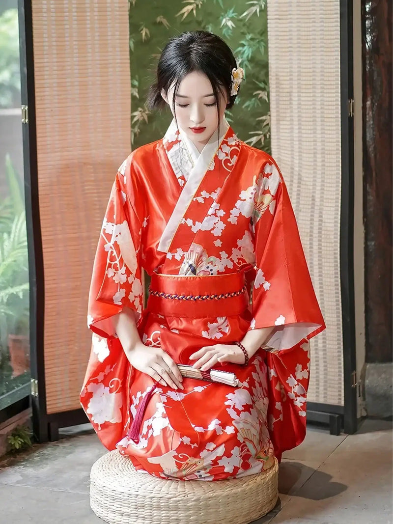 Le Kimono Japonais Momiji incarne la noblesse et la poésie du vêtement traditionnel nippon. Sa teinte rouge éclatante, rehaussée de motifs délicats de fleurs de cerisier et d’éventails dorés, évoque les saisons festives du Japon, tout en affirmant une silhouette gracieuse et affirmée.