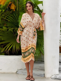 Inspiré des motifs ethniques et du charme des tissus traditionnels, ce kimono se distingue par son imprimé riche et harmonieux, ses bordures fleuries, et ses couleurs soigneusement pensées pour flatter toutes les carnations.