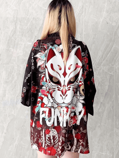 Affirmez votre style avec un symbole puissant du folklore japonais. Cette veste kimono noire arbore un grand masque de kitsune blanc au dos, entouré de fleurs et de motifs rouges. Symbole d’intelligence et de protection dans la culture japonaise, ce design marquant attire immédiatement l’attention tout en conservant l’élégance d’un style traditionnel revisité.