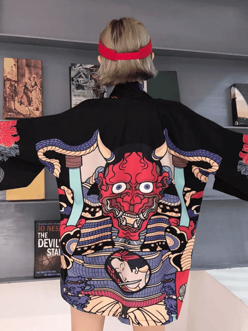 Affirme ton style avec la Veste Kimono Oniyasha, une pièce audacieuse inspirée de l’univers japonais traditionnel. Ce kimono streetwear arbore un imposant masque oni rouge, symbole de puissance et de protection dans la culture nippone. Les détails minutieux, comme les dragons sur les manches et les fleurs de pivoine, ajoutent une touche à la fois mythologique et élégante.