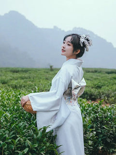 Le Kimono Yukine séduit par sa sobriété et sa délicatesse. Confectionné dans un tissu fluide au ton bleu-gris pâle presque givré, il évoque la pureté d’un matin d’hiver au cœur des montagnes japonaises. Sa ceinture obi ornée de motifs traditionnels apporte un contraste discret et raffiné, accentuant la silhouette sans l’alourdir.